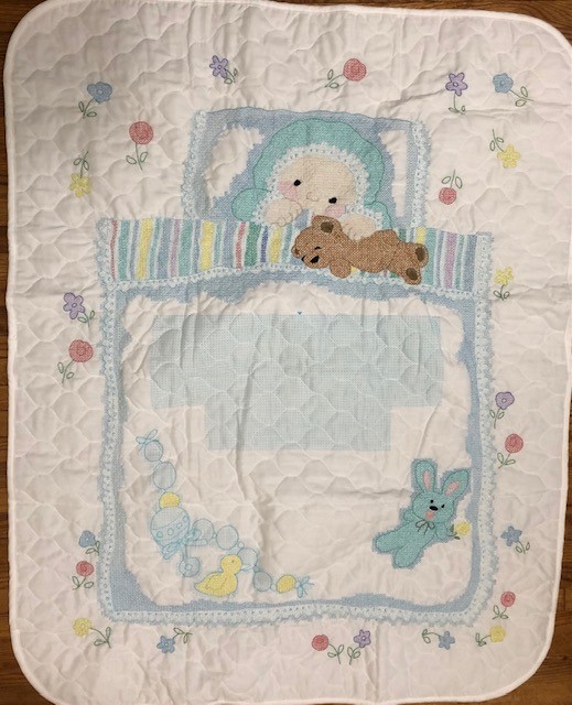 When I was expecting #1son, my mom had found at a five and dime a stamped baby blanket, and that became the special treasure she made for his birth. I had not seen those projects in stores and was interested instantly. When lots of friends my age were having babies, I made quilts for their kids. They saved those quilts and are passing them down to their grandkids.